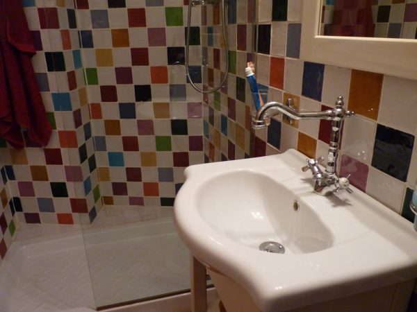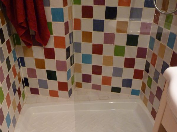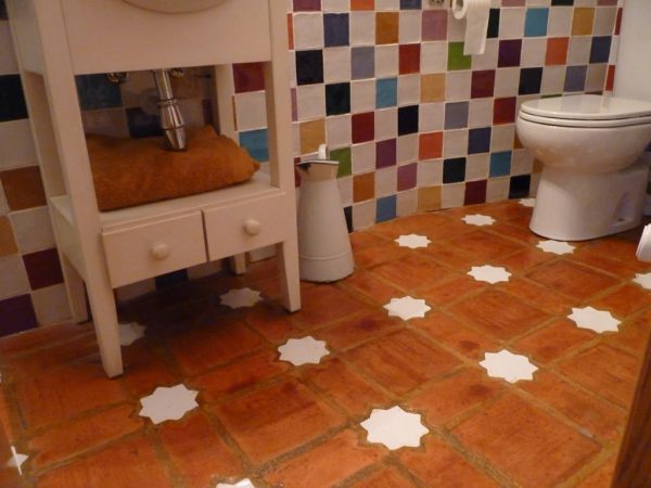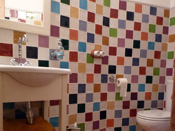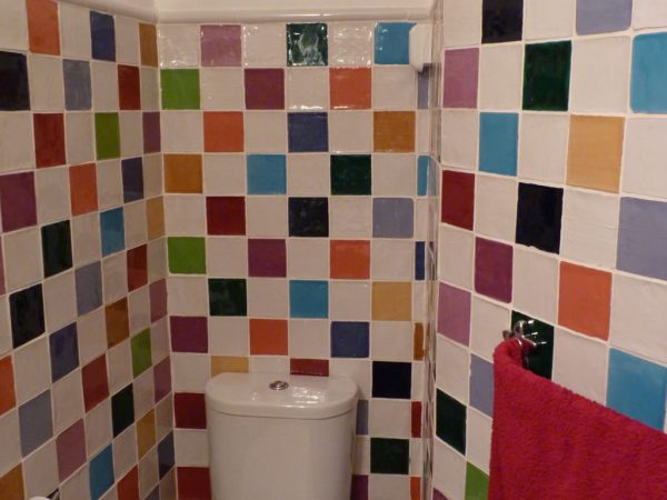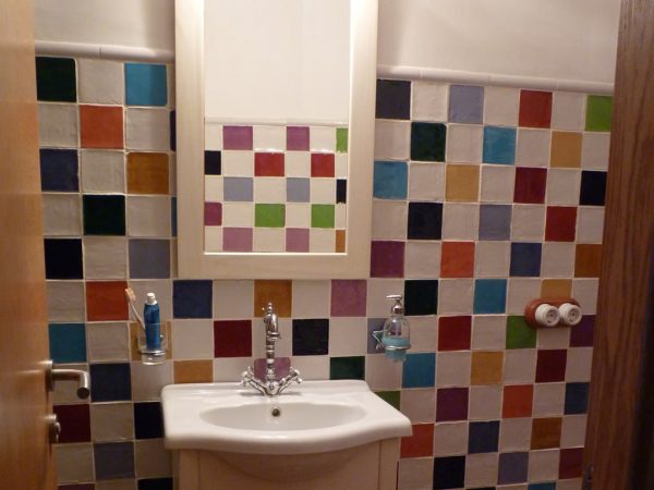 Este baño se realizó con azulejos de baño con una mezcla de colores vivos esmaltados a mano sobre azulejo de 10 x 10 rústico, en este alicatado predomina el blanco antiguo. Los colores son interrumpidos continuamente con un azulejo blanco antiguo, en esta ocasión el alicatado no tiene rodapié, el remate final del alicatado que no llega hasta el techo está finalizado con un Bordón de 3 cm en blanco roto.