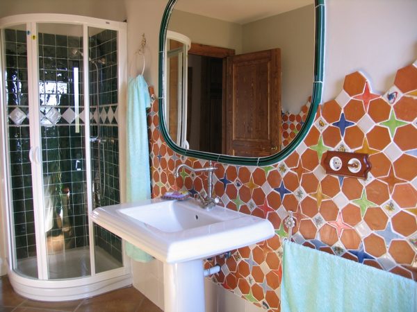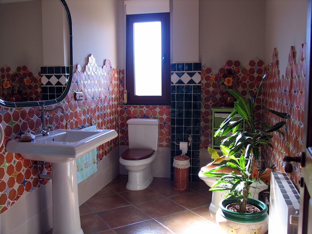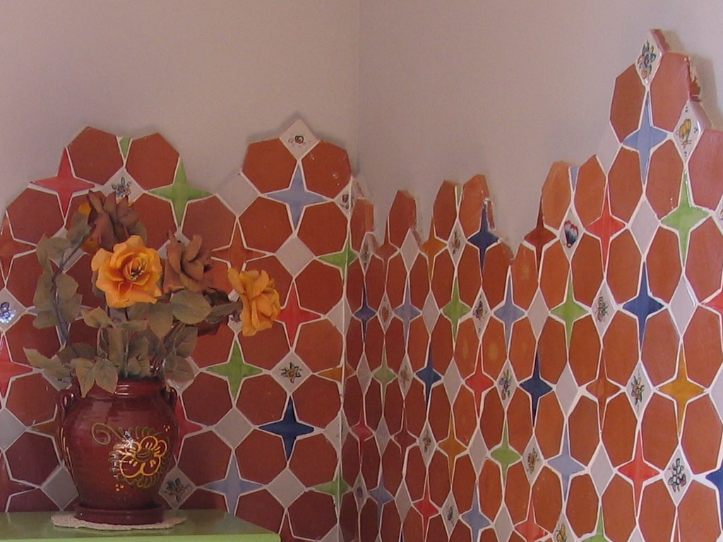 Espectacular baño realizado con diferentes tipos de azulejos de cerámica pequeños a mano, estrellas, hexágonos y tacos de 5 x 5 cm. en blanco y con flores y mariposas también pintadas a mano. Se empezó el alicatado con un guardapolvos de 20 x 20 cm, cortado irregular, desde donde empieza el fantástico alicatado, este alicatado no tiene moldura de remate dejando que sea el alicatado a diferentes alturas quien termine con el mismo a diferentes alturas. El pilar y la ducha se alicató con azulejos. Consúltenos »