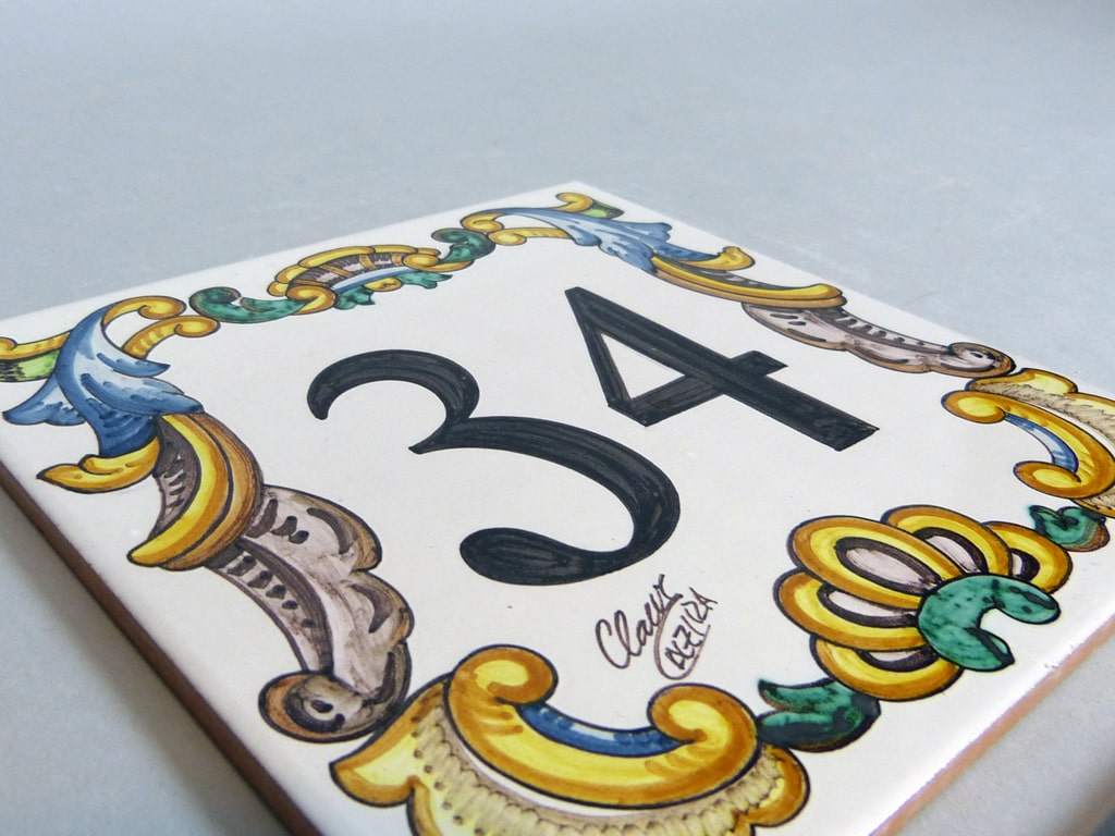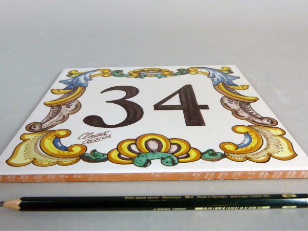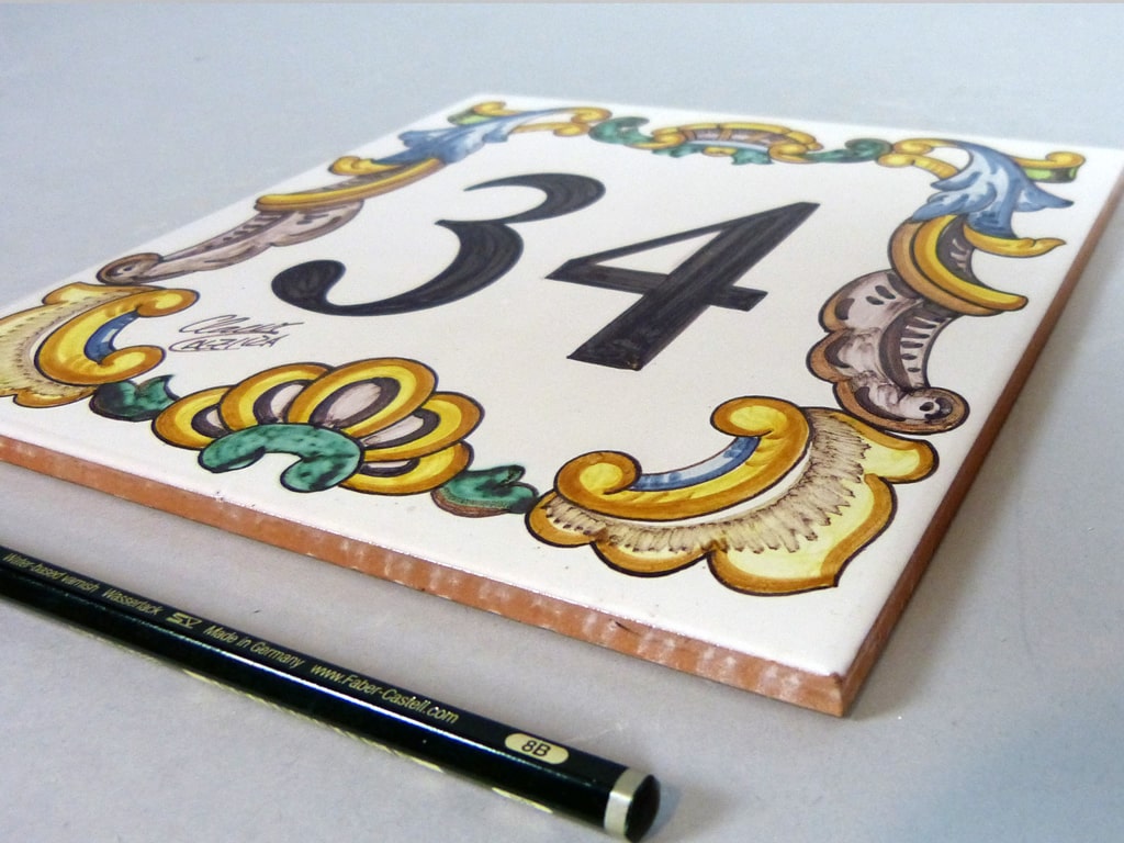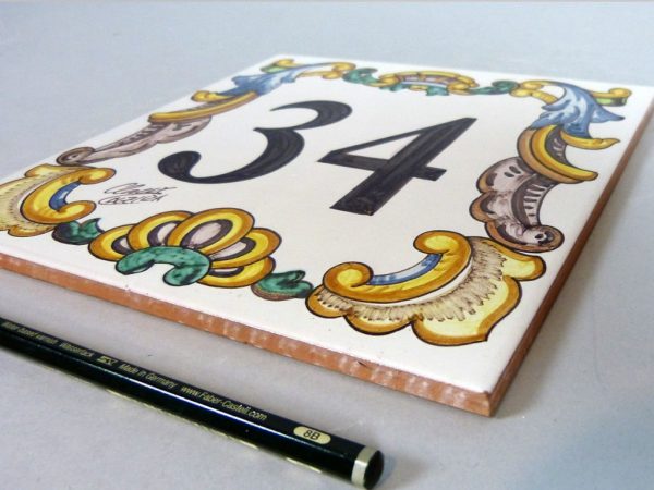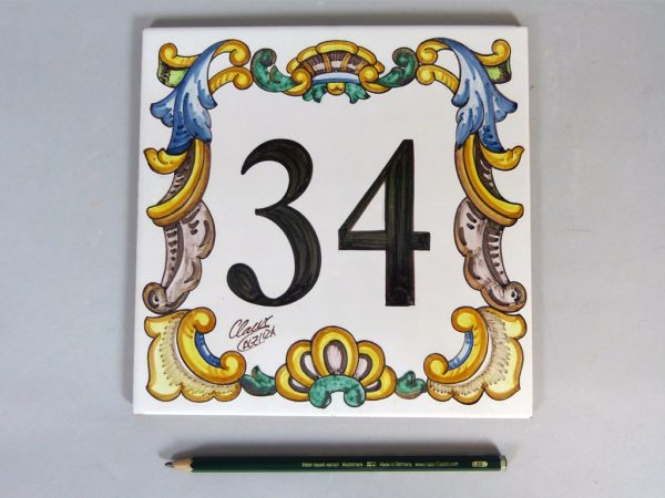 Azulejo de cerámica de 20 x 20 cm, pintado a mano con cenefa barroca y número de una, dos o tres cifras. Hacemos cualquier color, diseño, dibujo, logotipo o tipo de…