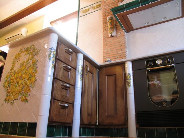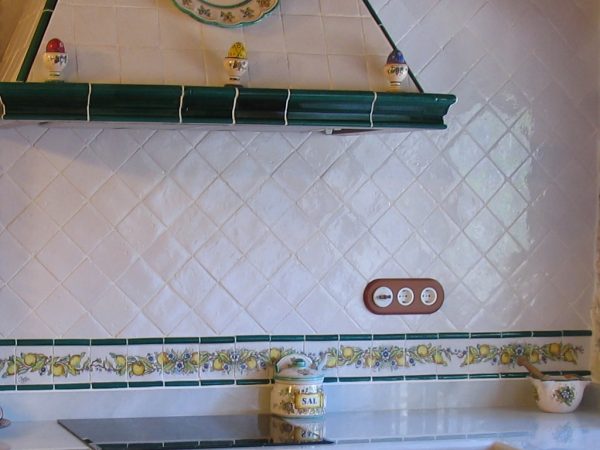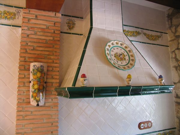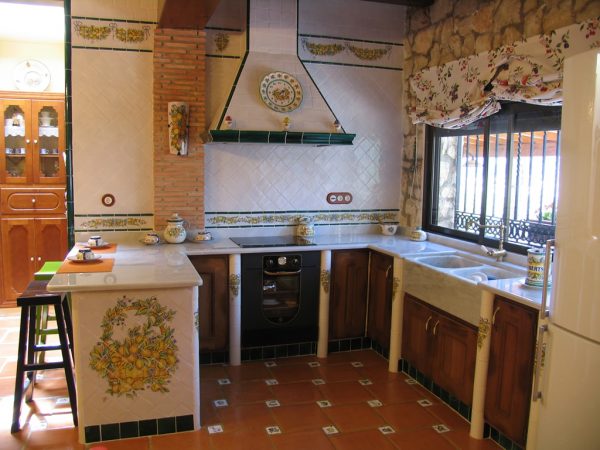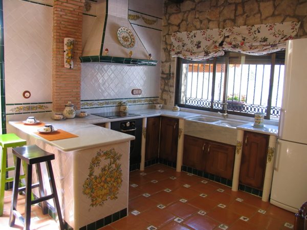 Cocina alicatada con azulejos de cerámica de 10 x 10 cm blanco antiguo, el pilar que se encuentra al lado de la campana, se alicató con caravista de barro manual cocido, donde se colocó una teja hecha a mano y decorada con naranjas y limones como la cenefa. La campana se realizó con la moldura barsella en verde claur, alicatada con azulejos de 10 x 10 y las aristas rematadas con media caña de 3 x 20 en verde claur, la cenefa alta de la cocina se pintó con guirnaldas de naranjas y limones, está cenefa se pintó a medida para cada sitio, El remate de que el final de la barra se alicató con una cesta pintada a mano con naranjas y limones. Las puertas de esta cocina están separadas por tabiques de obra, los cuales se remataron con media caña pasamano pintadas con lazos de naranjas y limones.Todas las piezas de complemento de esta cocina se realizaron a juego con las cenefas y colores de la misma, como se aprecia en el reloj de la campana, el salero y otros. El pavimento de esta cocina está realizado con azulejos de 30 x 30 en barro manual, que incorpora también azulejos de 8 x 8 cm decorados con frutas. Consúltenos »