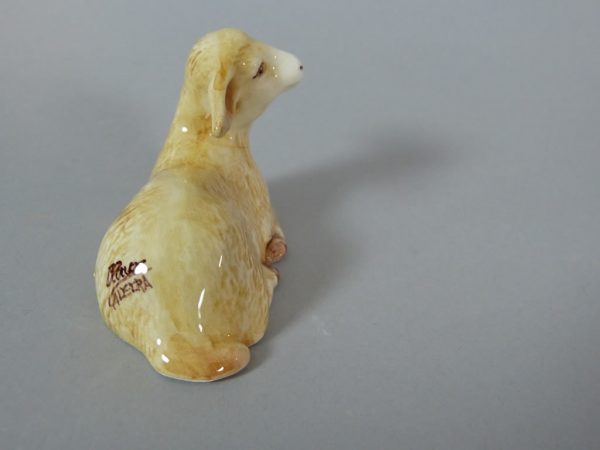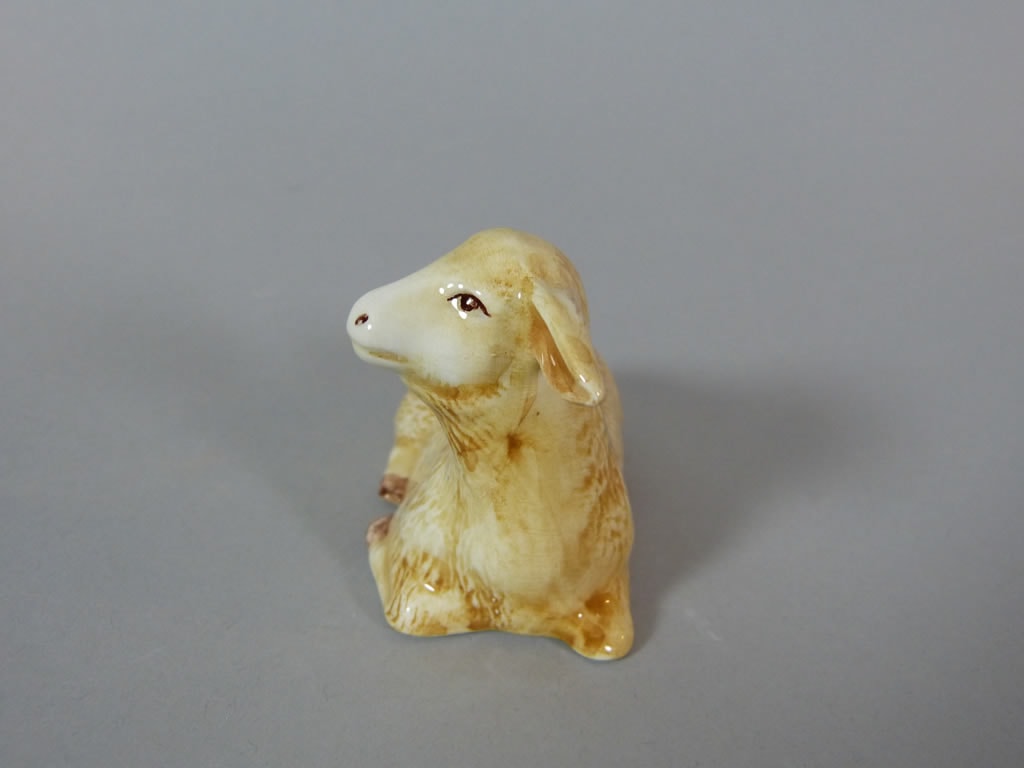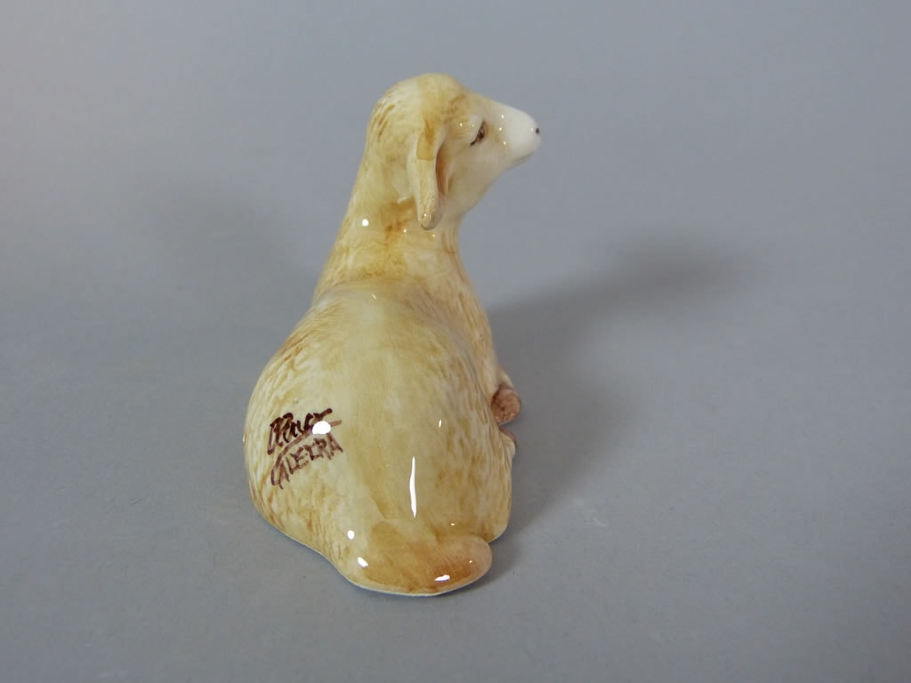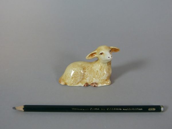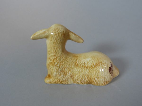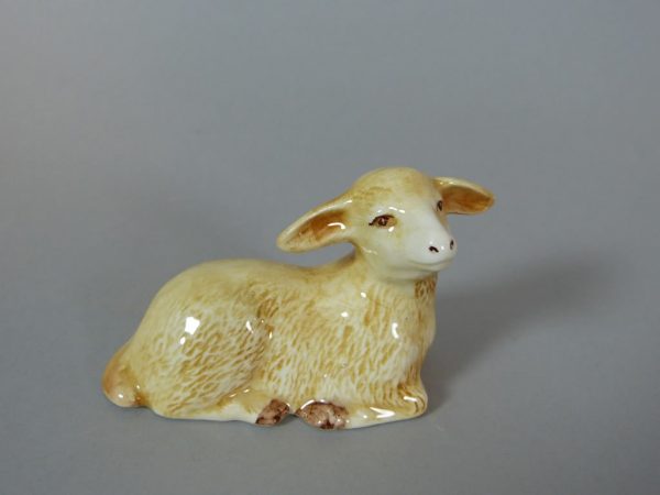 Cordero de cerámica para el belén, pintado a mano con colores ocres y amarillo.
