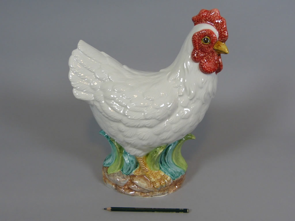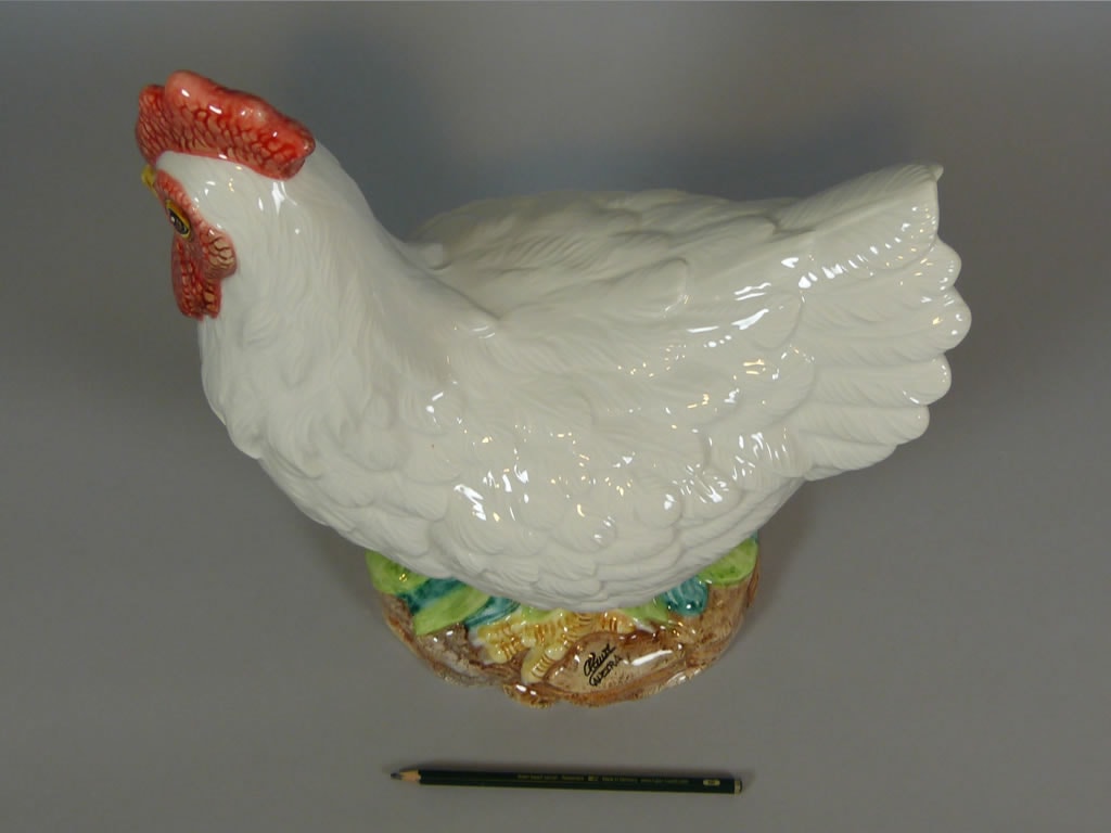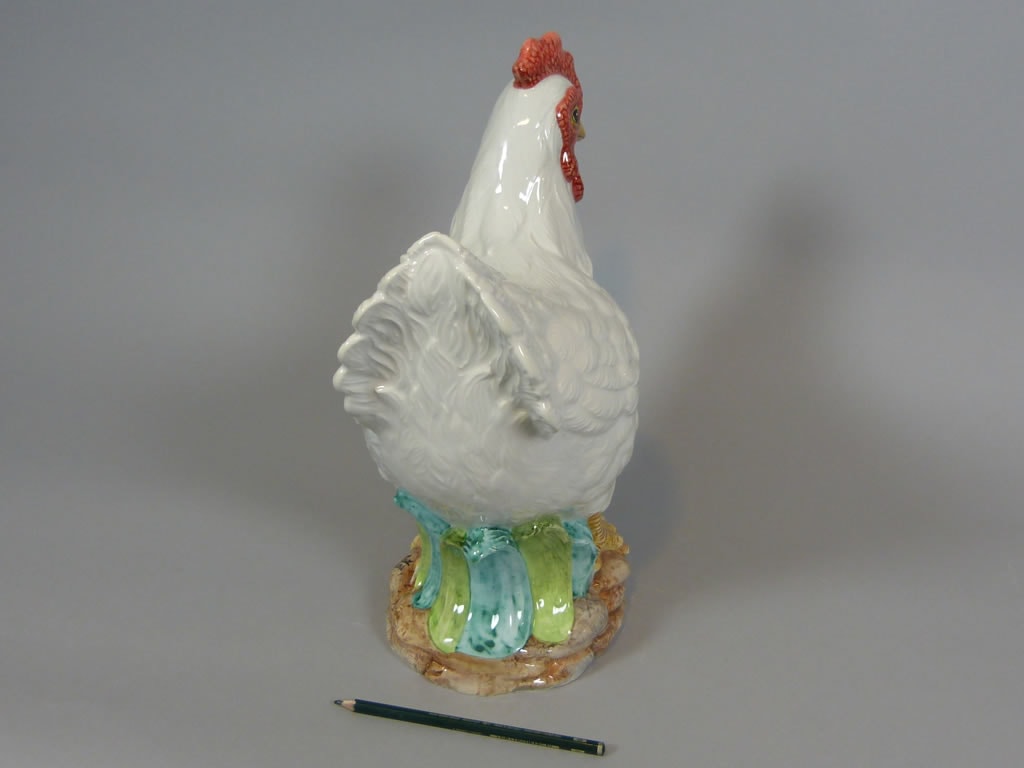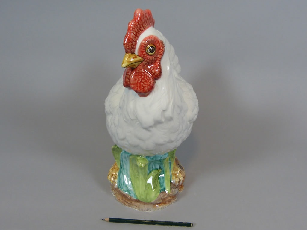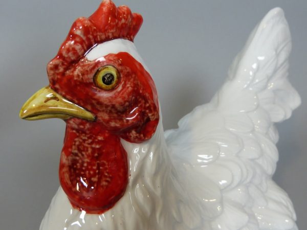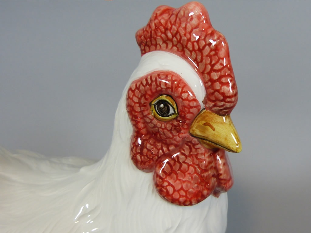 Gallina de cerámica blanca pintada a mano con mucho cuidado dando detalles como la cresta en color rojo, que es bien sabido en la cerámica es…