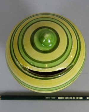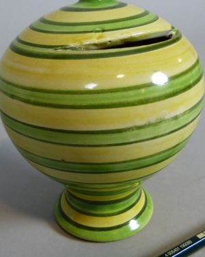 Hucha de cerámica rayadas de amarillo y verde, se puede añadir el nombre o con el nombre de cada niño invitado a la fiesta. Hucha sencilla que puede regalarse el cumpleaños, reuniones de empresa, familiares, bodas, etc… Consúltenos »