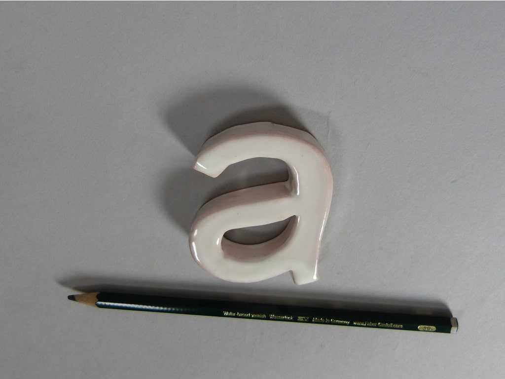Letra de cerámica tipografía Arial Minúscula, esmaltadas en cualquier color y textura, en esta ocasión las letras están esmaltadas en color blanco roto.