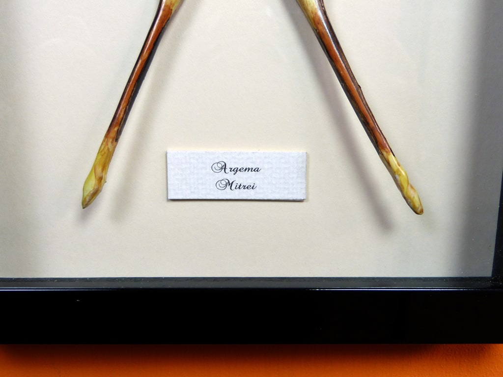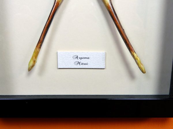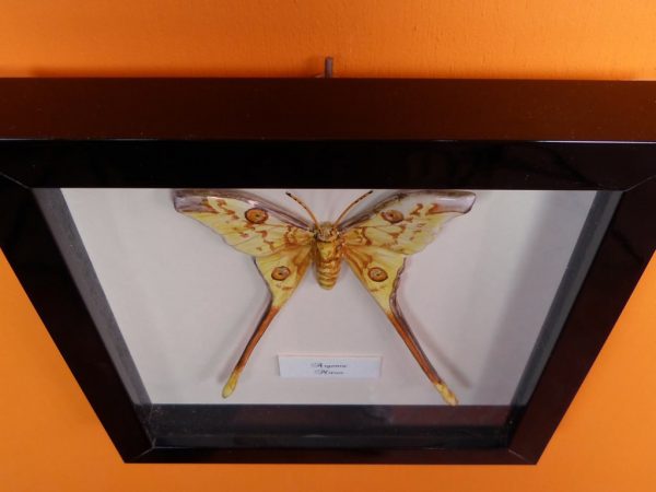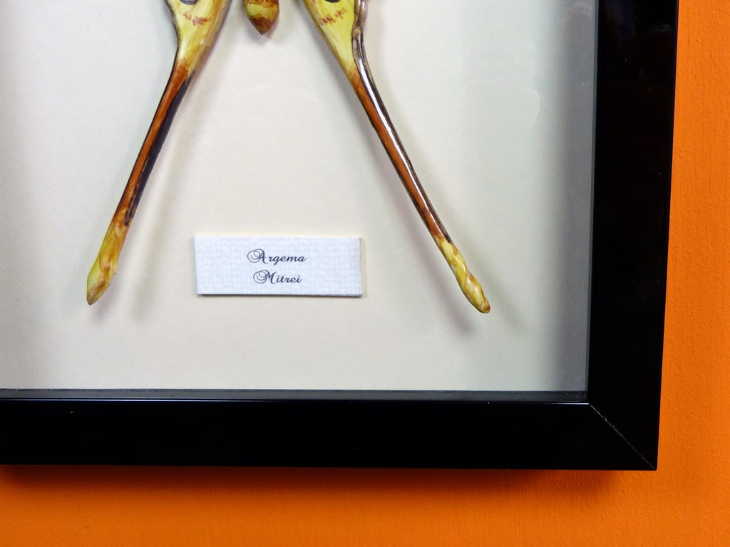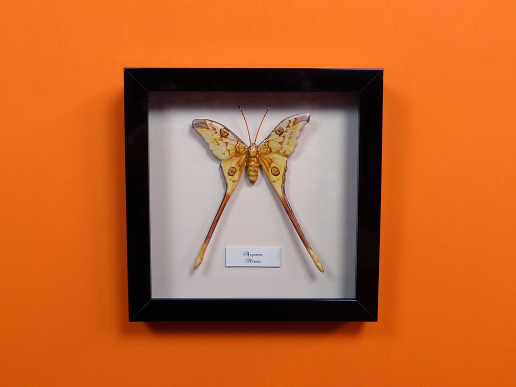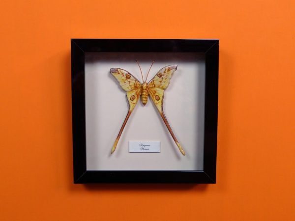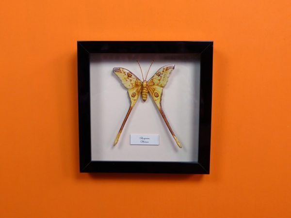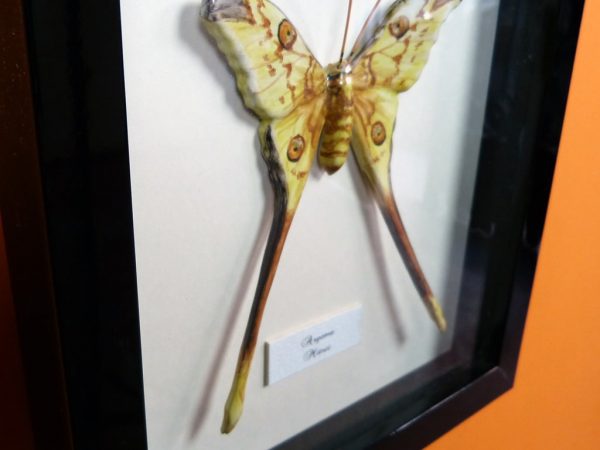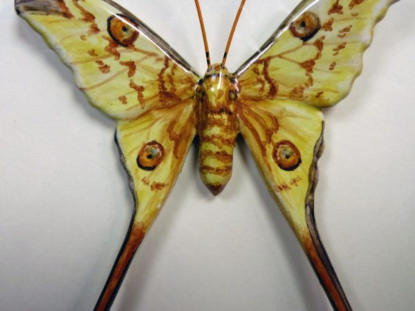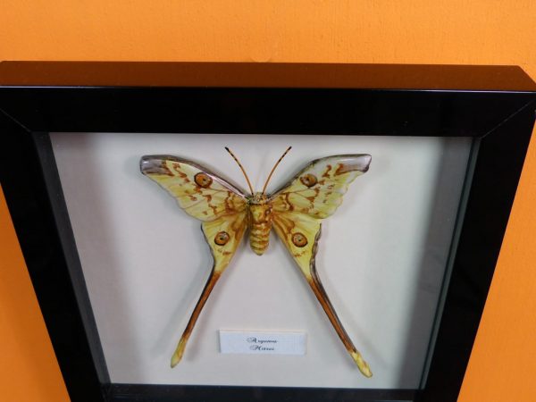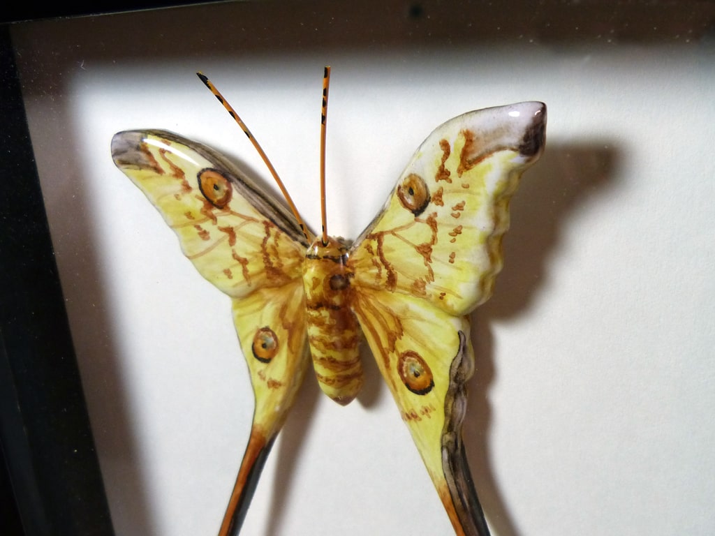 Mariposa de cerámica hecha y pintada a mano, reproducción auténtica de los colores de la original de la mariposa Argema Mitrei. El marco utilizado para esta mariposa es de madera color negro y decorado en los cuatro laterales con pintura blanca a mano haciendo una delicada cenefa. Bajo pedido se puede encargar cualquier tamaño de mariposa, marco y decoración del marco. Consúltenos »