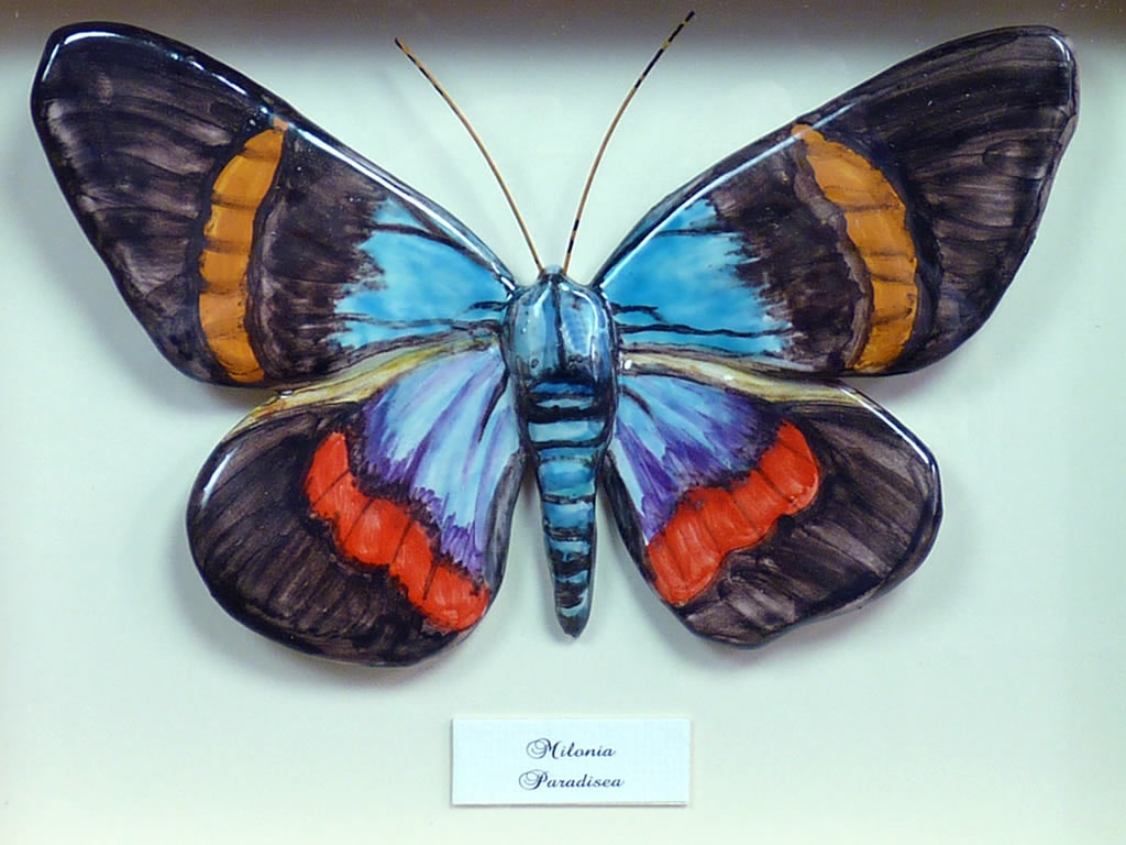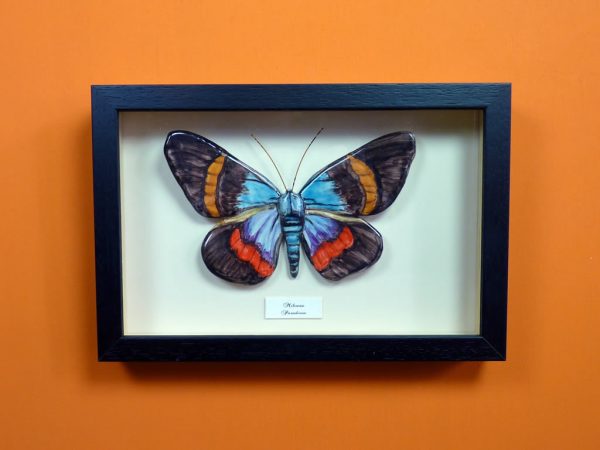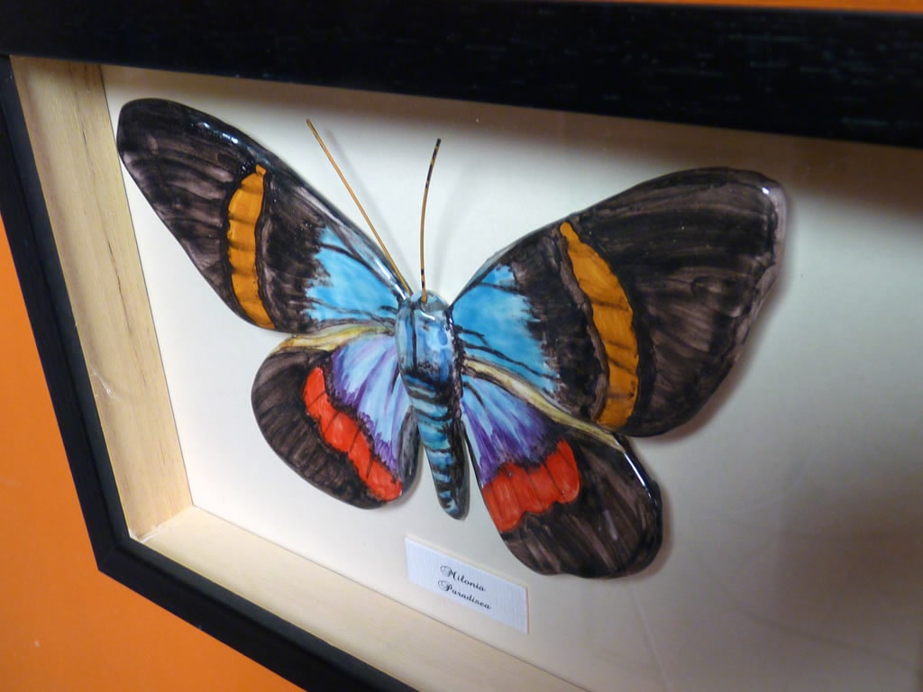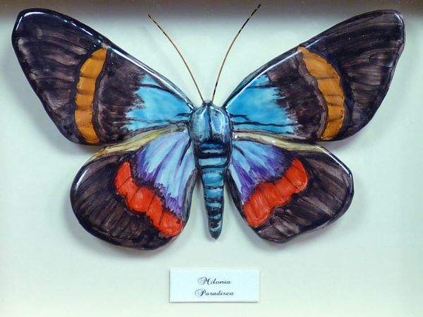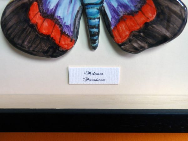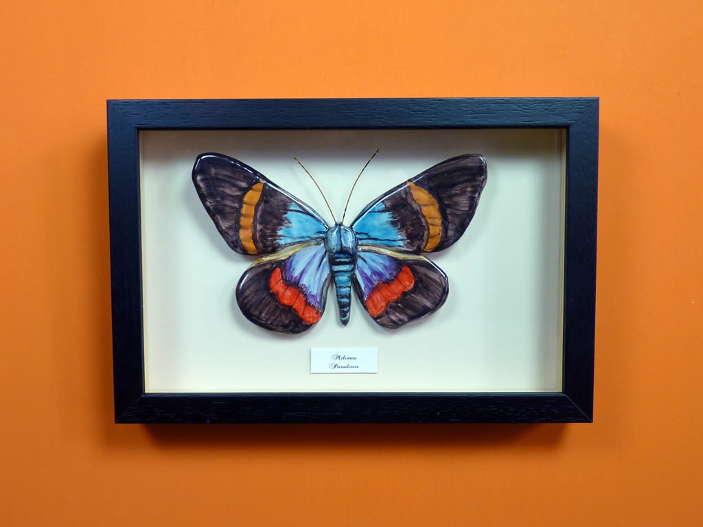 Mariposa de cerámica hecha y pintada a mano, reproducción auténtica de los colores de la original de la mariposa Argema Mitrei. El marco utilizado para esta mariposa es de madera color negro y decorado en los cuatro laterales con pintura blanca a mano haciendo una delicada cenefa. Bajo pedido se puede encargar cualquier tamaño de mariposa, marco y decoración del marco. Consúltenos »