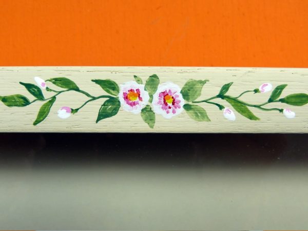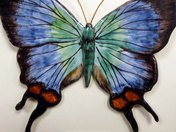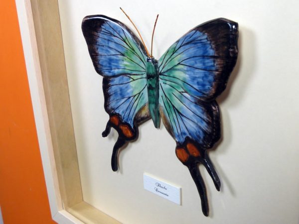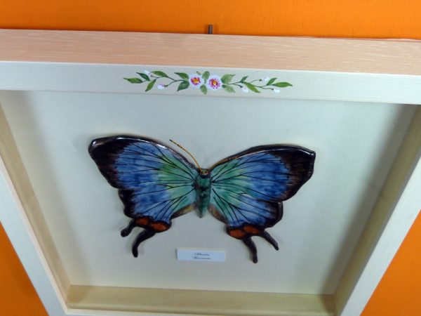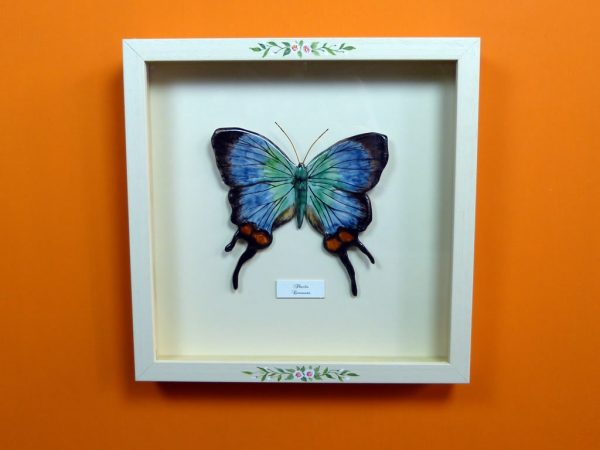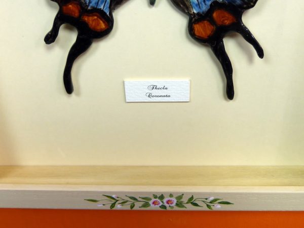 Mariposa de cerámica artesanal con marco de madera con cristal de protección. Marco de madera color blanco mate con el fondo de passepartout blanco roto con reproducción de mariposa de cerámica, Thecla Coronata con su nombre al pie de la mariposa. El marco de madera blanco roto está pintado a mano con unas flores con capullos y hojas en el centro superior e inferior. Bajo pedido se puede encargar cualquier tamaño de mariposa, marco y decoración del marco. Consúltenos »