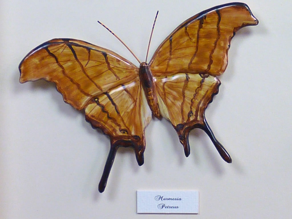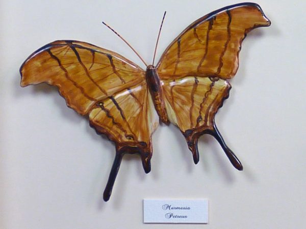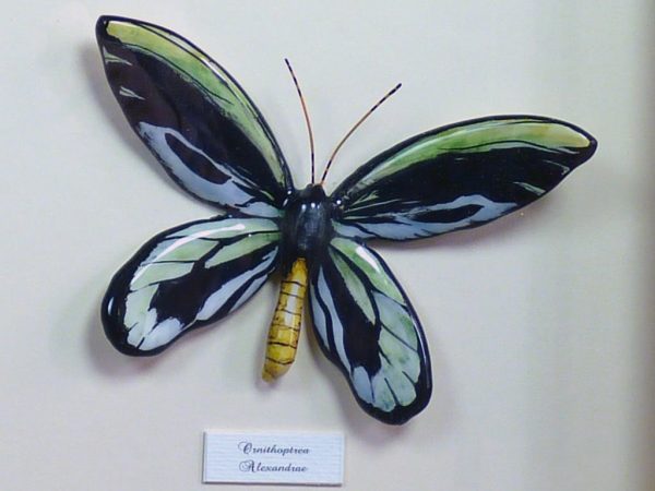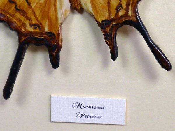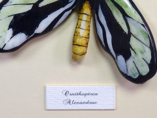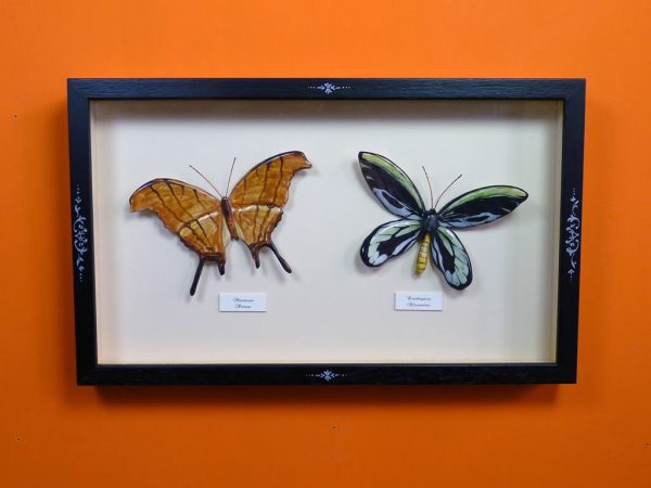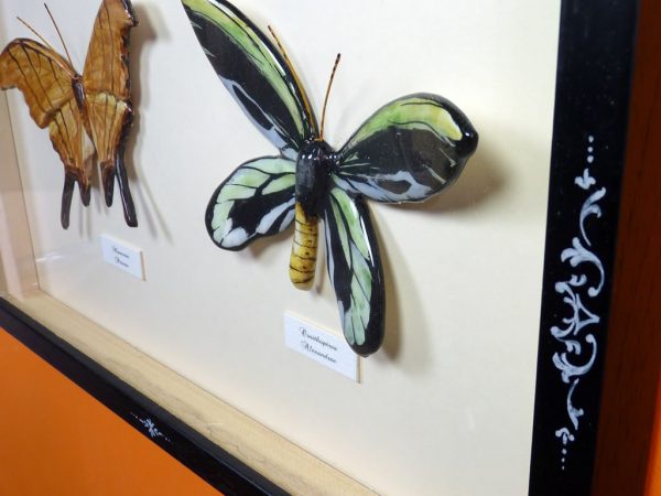 Mariposas de cerámica con marco de madera negro pintado a mano en color blanco, con dos mariposas de cerámica modeladas y pintadas a mano, “Petreus y Ornithoptera”, las mariposas están dentro del marco y protegidas por un cristal, el fondo es de pasta paspartú blanco. Bajo pedido se puede encargar cualquier tamaño de mariposa, marco y decoración del marco. Consúltenos »