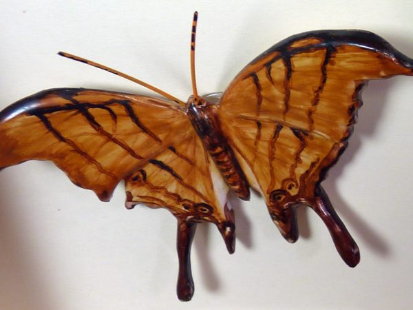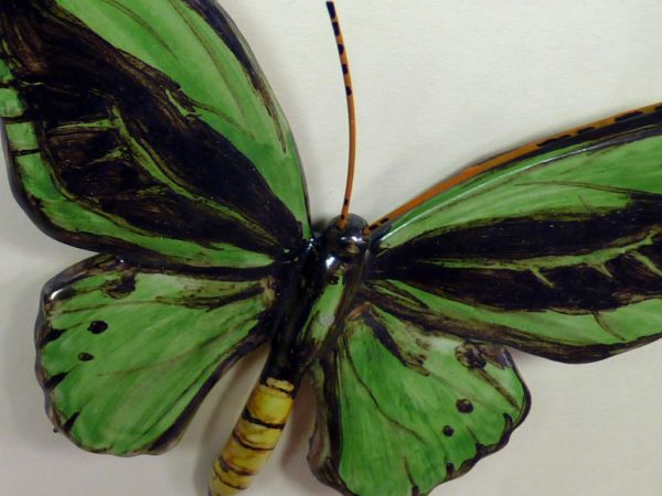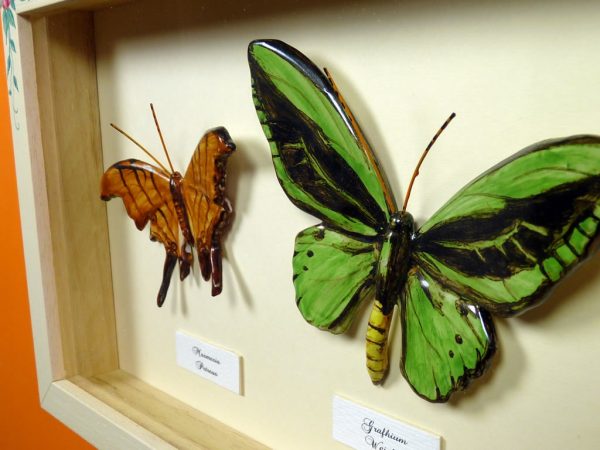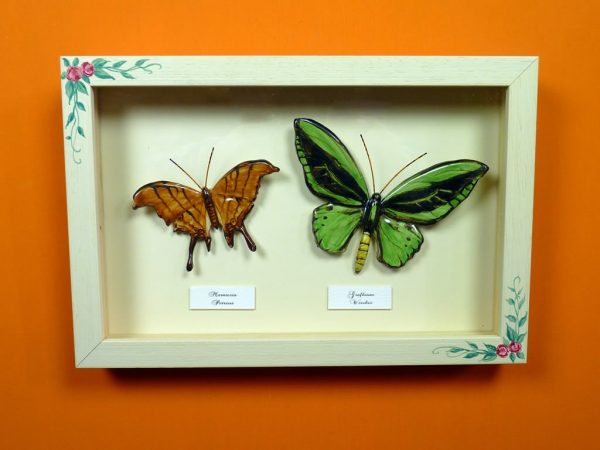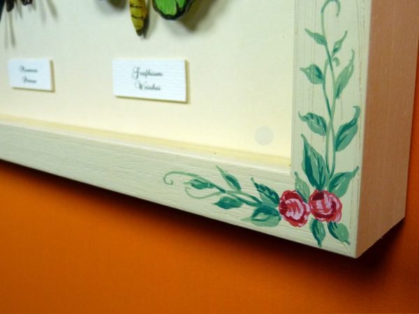 Dos mariposas de cerámica con marco de madera con cristal de protección. Marco de madera color blanco mate con el fondo de passepartout blanco roto con reproducción de dos mariposas de cerámica, Ornithoptera Priamus y Marmesia Petreuscon con sus nombres al pie de la mariposa. El marco de madera blanco roto está pintado a mano con unas rosas y hojas en las esquinas del marco. Bajo pedido se puede encargar cualquier tamaño de mariposa, marco y decoración del marco. Consúltenos »