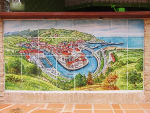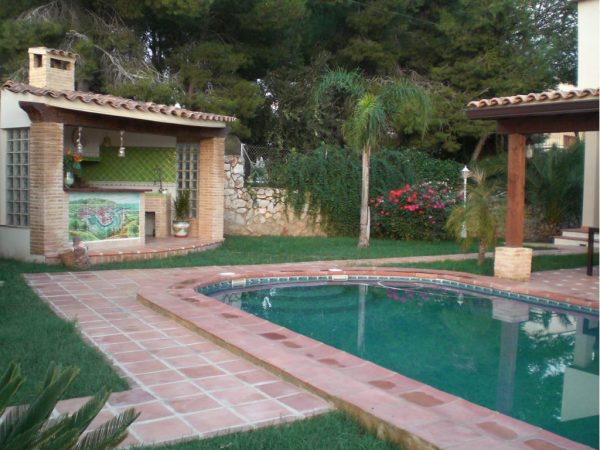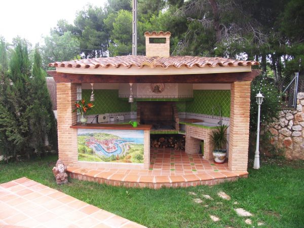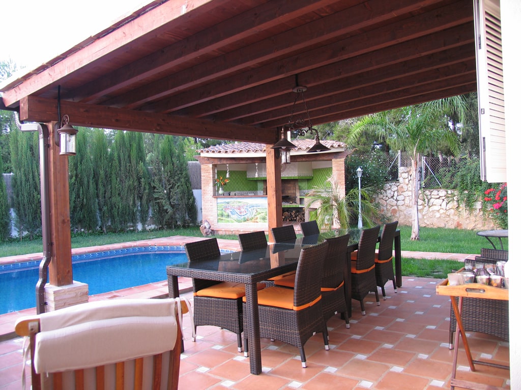 Paellero de cerámica construido en forma de cuña. El techo de teja está descansado sobre una vida de madera vieja de 30 x 30 cm, que al mismo tiempo descansa sobre dos pilares de caravista de baldosas de barro cocido manual, una barra separa el exterior del interior del paellero, en esta barra se colocó un mural pintado a mano en azulejos de 20 x 20 cm, con la vista del pueblo del cliente, el pavimento que se colocó en este paellero tres de 20 x 20 cm, con navadas y estrellas de color verde manzana, al igual que los azulejos del paellero, sobre el banco se colocó un azulejo en blanco y encima una cenefa de manzanas verdes que luego se repiten también en la campana de extracción de humos, la campana tiene como remate una moldura ancha de 10 x 20 cm, en verde manzana, el remate final del pavimento en curva se realizó con baldosas de barro cocido de peldaños.Este paellero se instaló cerca de la piscina y del porche como indican alguna de las fotografías, para poder estar cocinando y disfrutando del espacio exterior. Consúltenos »