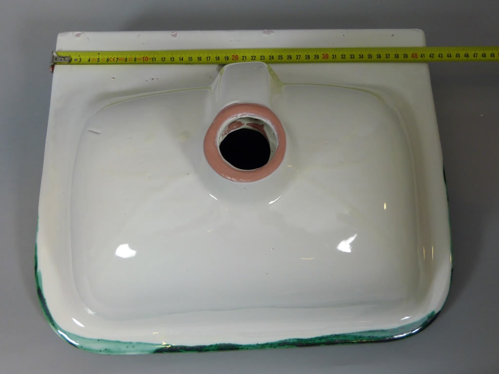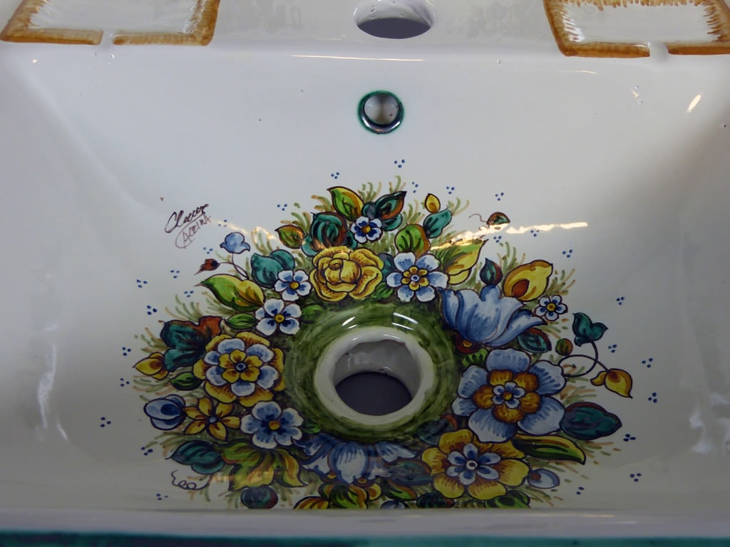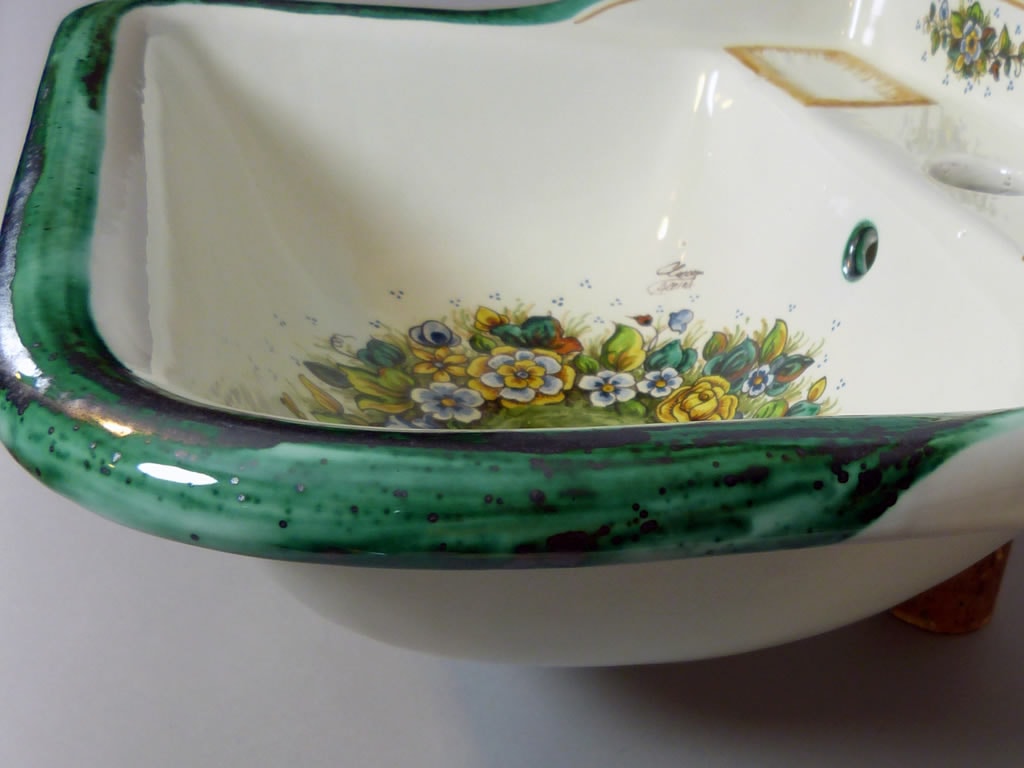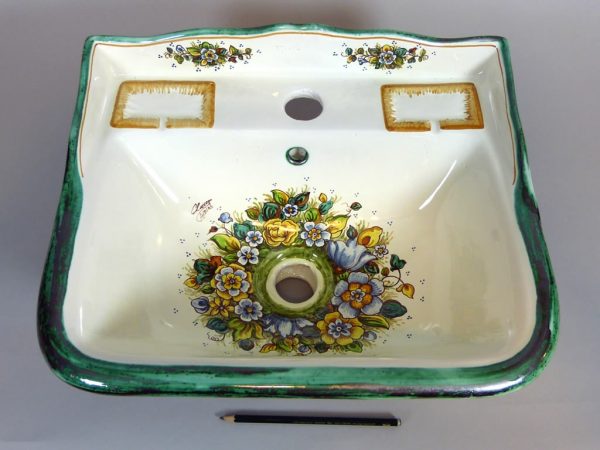 Pila de cerámica de 42 x 35,5 cm, pintada a mano con flores, cerrada en verde cobre. La pila de lavabo se puede pintar a gusto del cliente con los motivos o dibujos que indique a juego con su baño. Consúltenos »