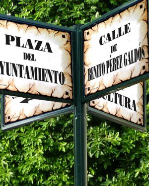 Póster de 300 cm de alto con una bandolera direccional y una placa de calle a una cara, pintada a mano, con o sin escudo. Las bandolera tienen un sistema que se puede girar en la dirección que se desee. Hacemos cualquier diseño, dibujo, logotipo o tipo de letra que el cliente proponga. La bandolera pude hacerse con dos placas una a cada cara. Consúltenos »