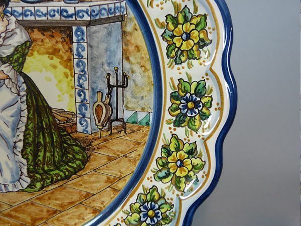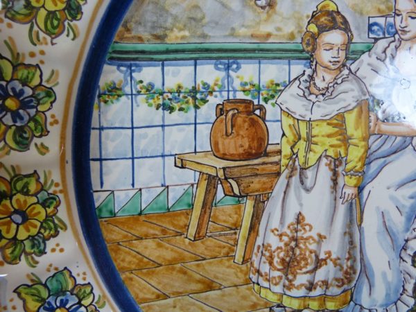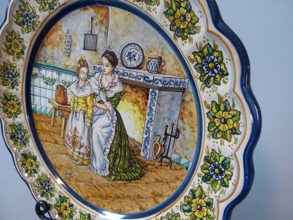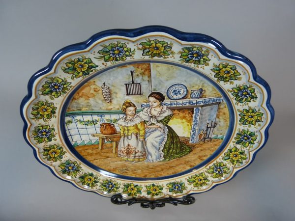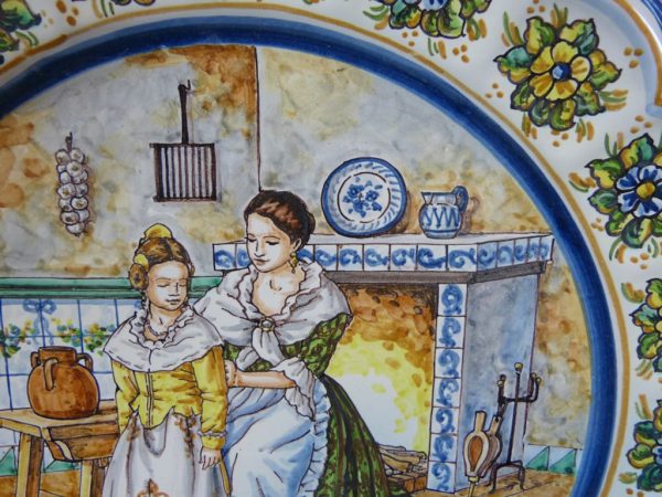 Plato de cerámica de 40 cm. Pintado a a mano con imagen típica estilo Sorollesco. La madre vistiendo a la fallera infantil junto al fuego. La decoración de los platos se puede modificar…