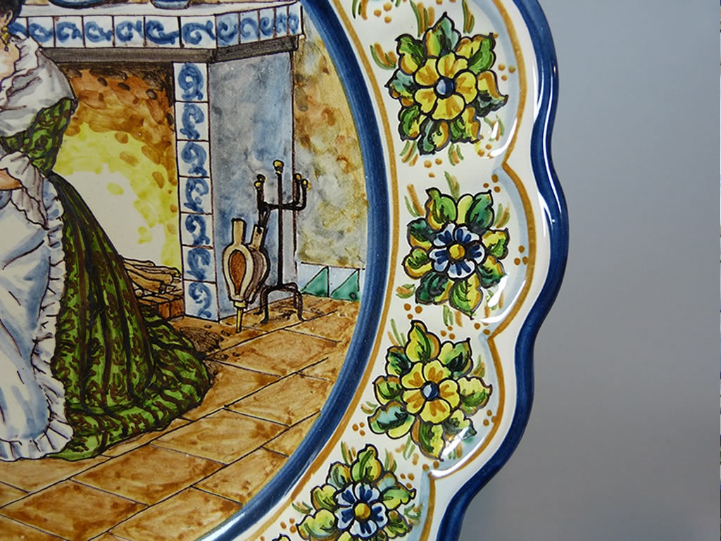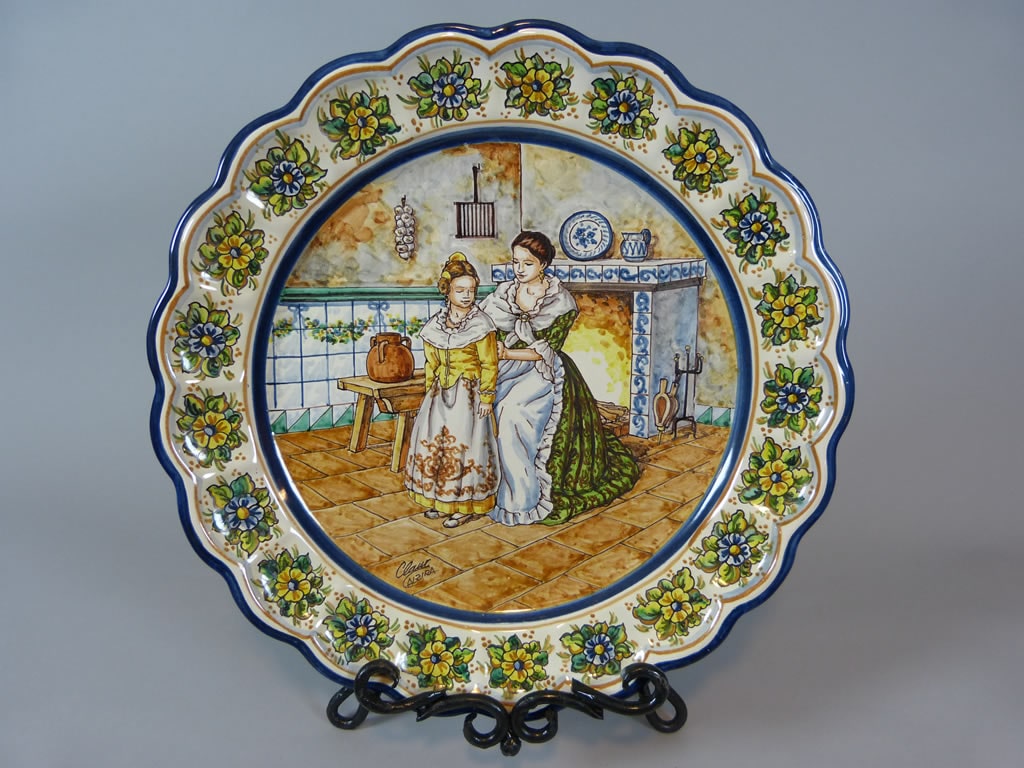 Plato de cerámica de 40 cm. Pintado a mano con imagen típica estilo Sorollesco. La madre vistiendo a la fallera infantil junto al fuego. La decoración de los platos se puede modificar ya que son pintados a mano o aplicar textos, fechas… También se puede cambiar el dibujo o la cenefa. Consúltenos »