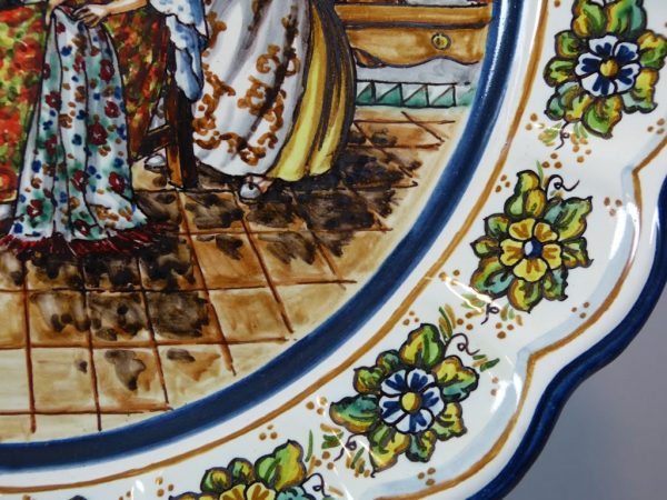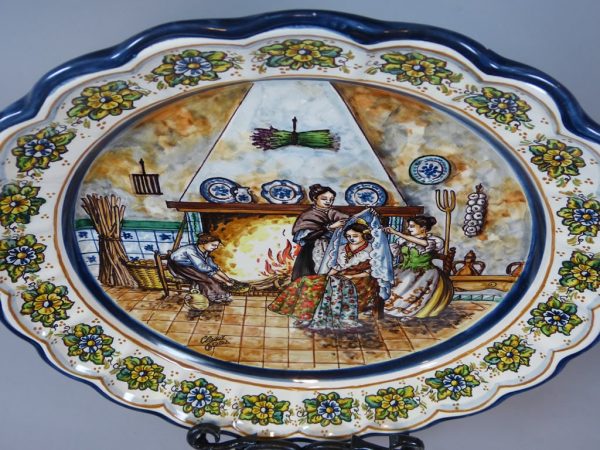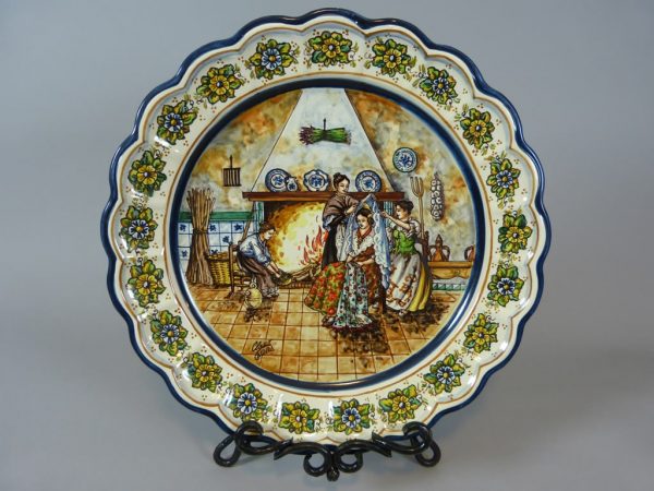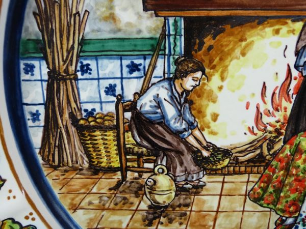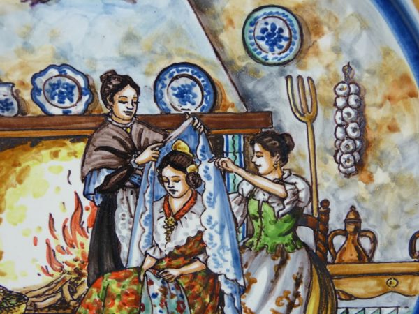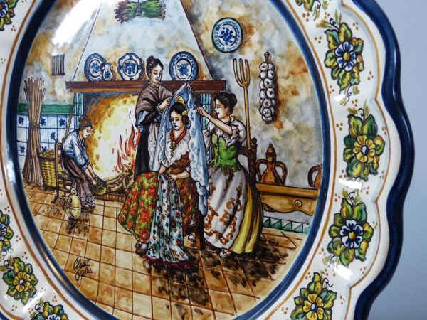Plato de cerámica de 40 cm. Pintado a mano con imagen típica estilo Sorollesco. La madre y la hermana ayudan a vestir a la fallera junto al fuego mientras la abuela prepara castañas tostadas. La decoración de los platos se puede modificar ya que son pintados a mano o aplicar textos, fechas… También se puede cambiar el dibujo o la cenefa. Consúltenos »