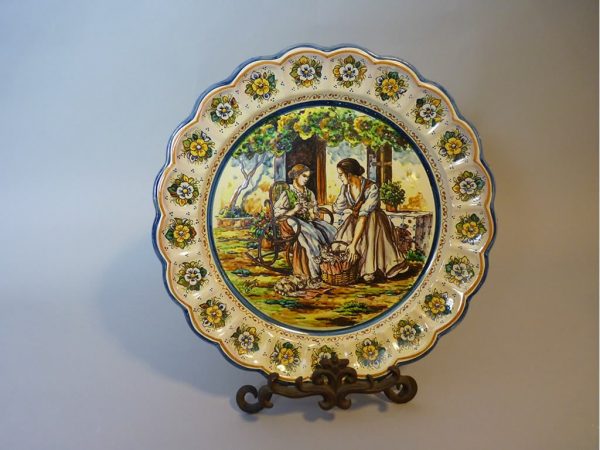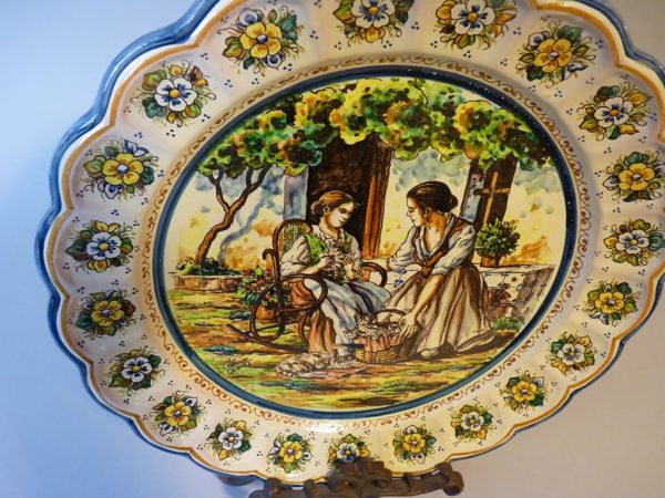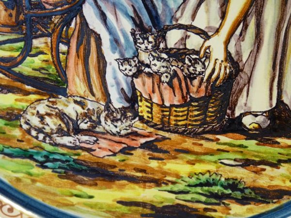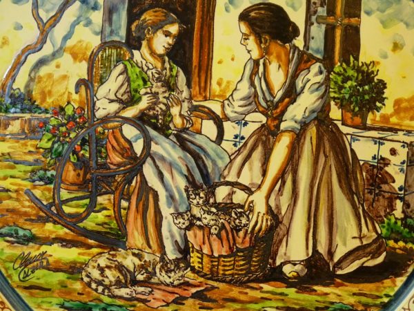 Plato de cerámica de 40 cm. Pintado a mano con imagen típica con las valencianas jugando con los gatitos pequeños en el patio de la casa junto a la parra de uvas. La decoración…
