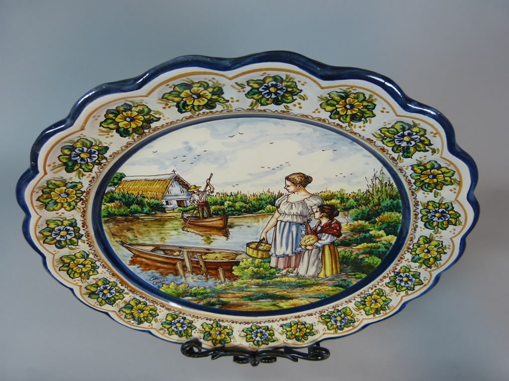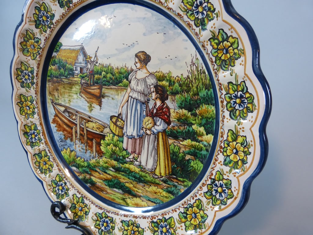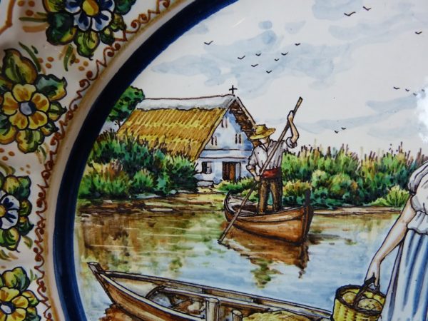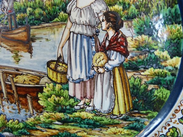 Plato de cerámica de 40 cm. Pintado a mano con imagen típica estilo Sorollesco. Las pescateras, madre e hija, esperan al pescador junto a una barca típica de pescador del Mareny en el río con la cesta del almuerzo. Al fondo se observa una barraca típica. La decoración de los platos se puede modificar ya que son pintados a mano o aplicar textos, fechas… También se puede cambiar el dibujo o la cenefa. Consúltenos »