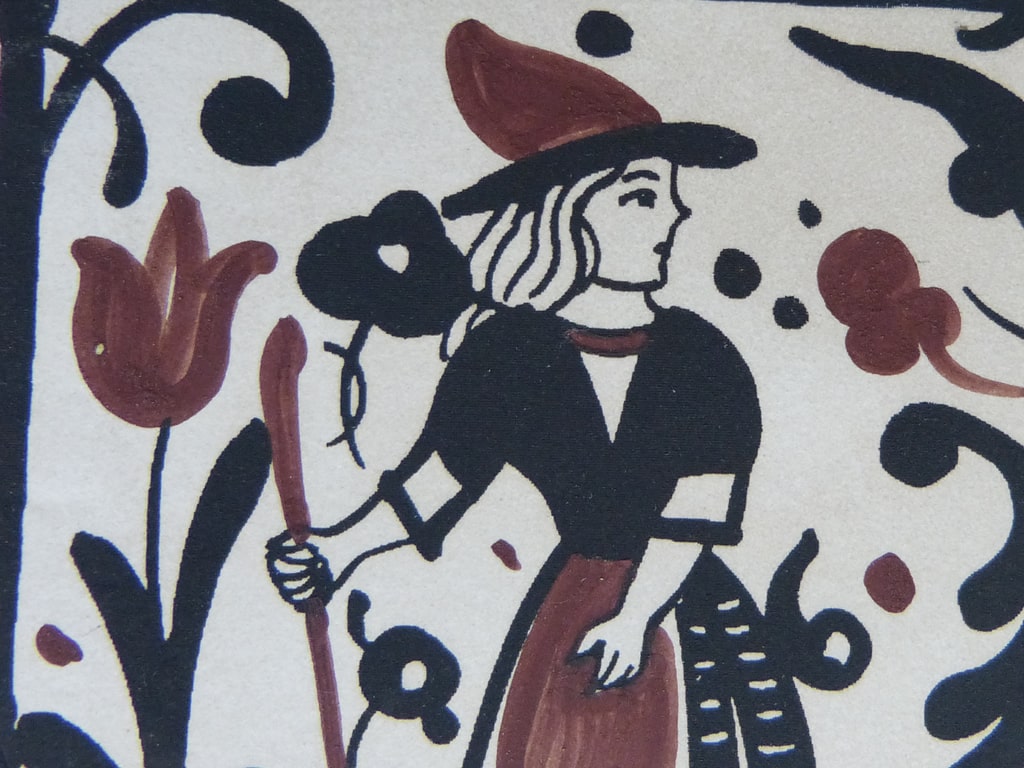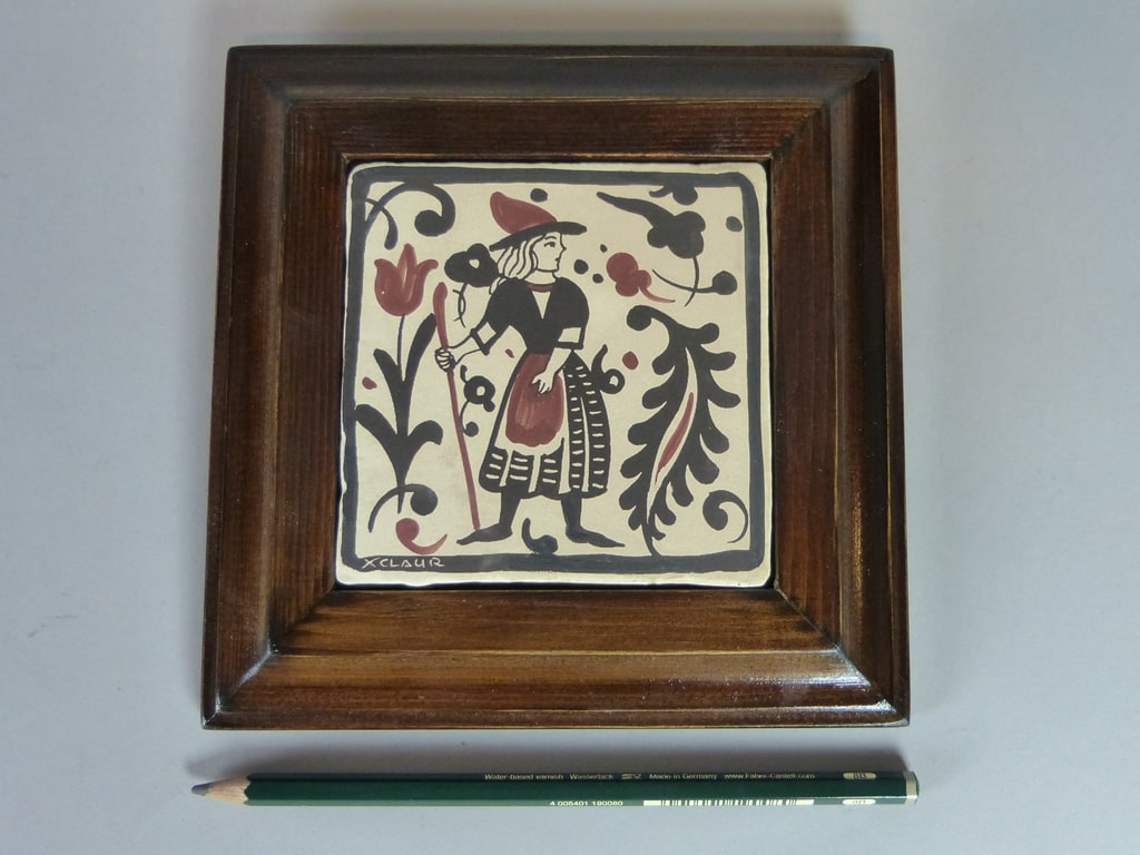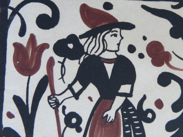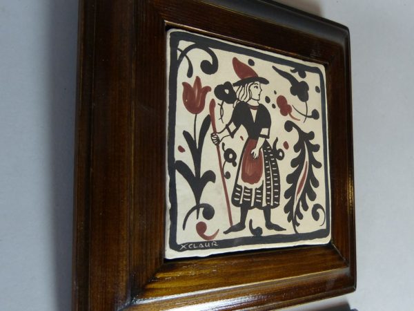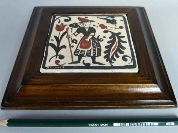 Socarrat de cerámica de 10 x 10 cm, pintado a mano, con marco, con la imagen de una mujer caminando con bastón. El Socarrat también se puede servir sin marco. Consúltenos »