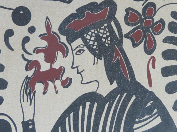 Socarrat de cerámica de 10 x 10 cm, pintado a mano, con marco, con la figura de una dama con copete. El Socarrat también se puede servir sin marco. Consúltenos »
