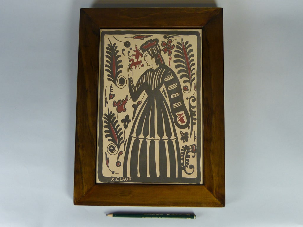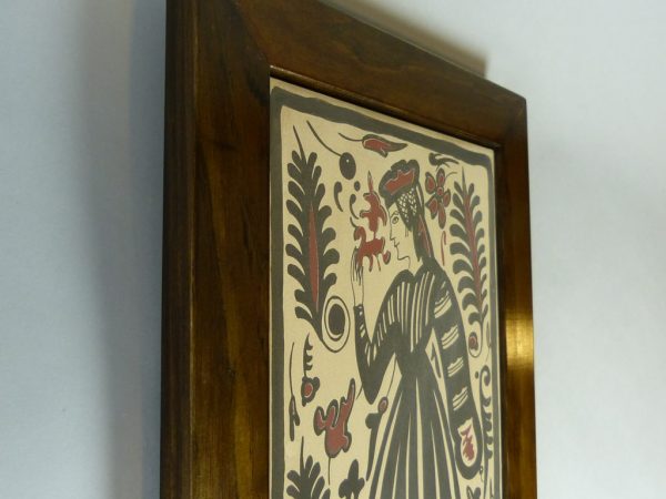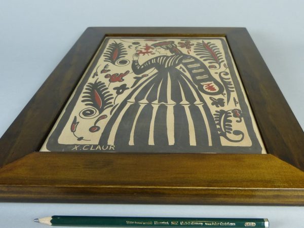 Socarrat de 10 x 10 cm, pintado a mano, con marco, con la figura de una dama con copete. El Socarrat también se puede servir sin marco.