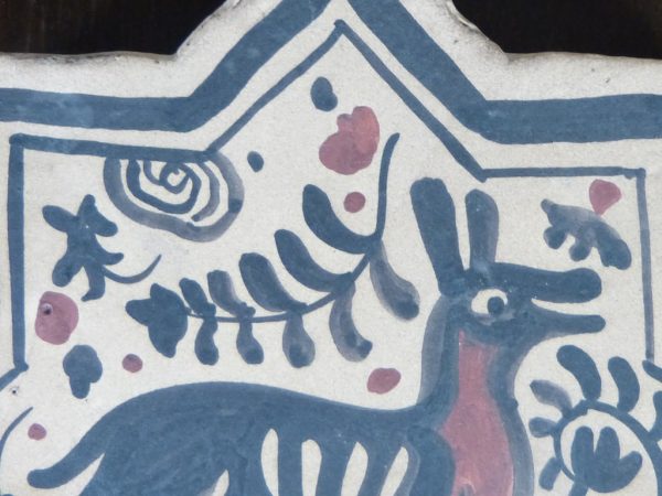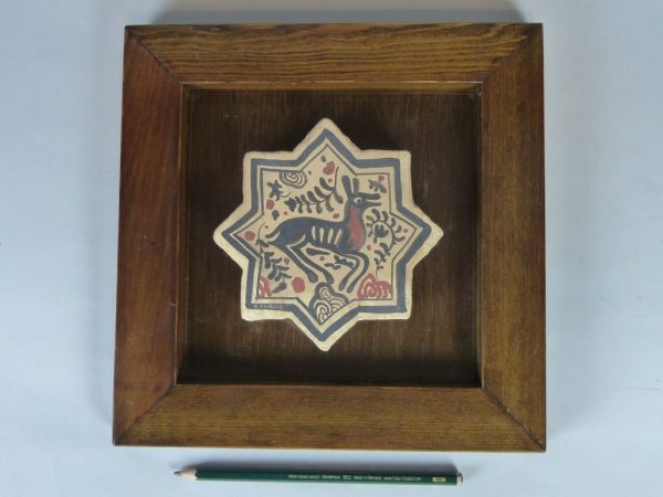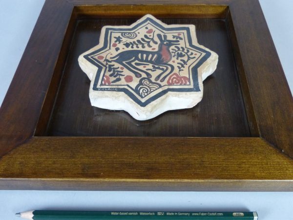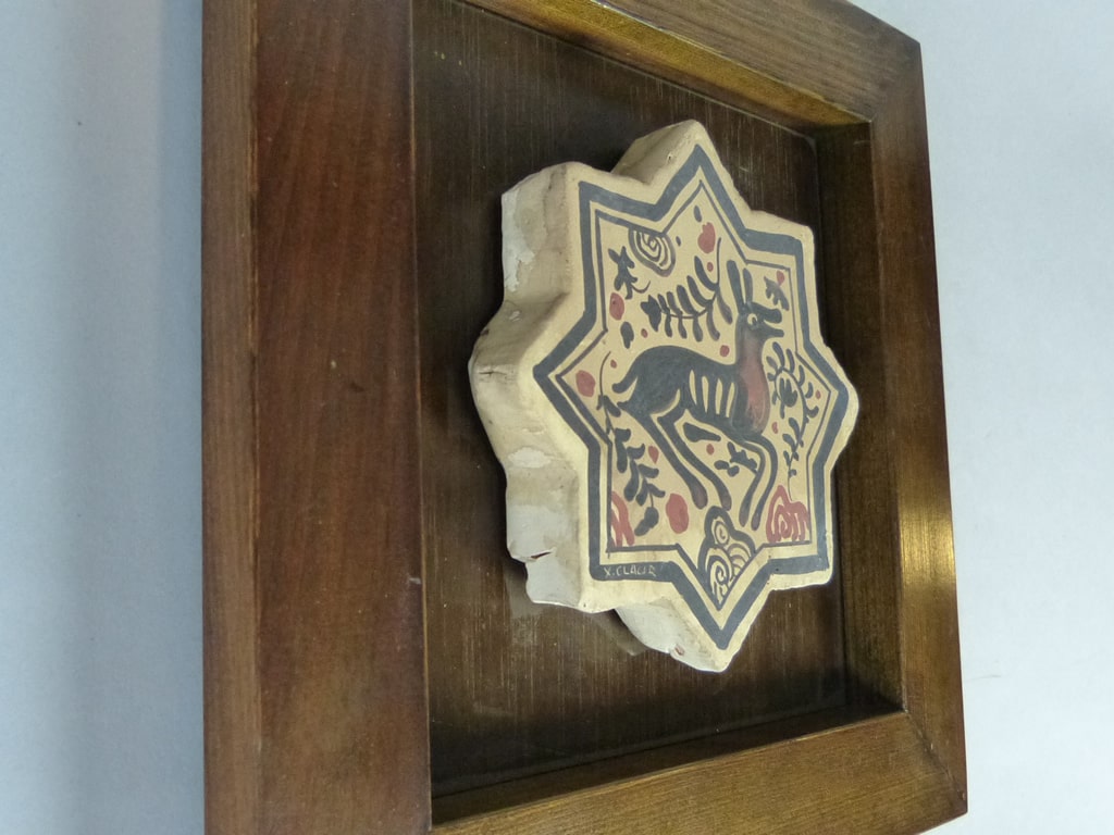 Socarrat de cerámica de 10 x 10 cm, pintado a mano, con marco, con marco de pino y representando un ciervo. El Socarrat también se puede servir sin marco. Consúltenos »