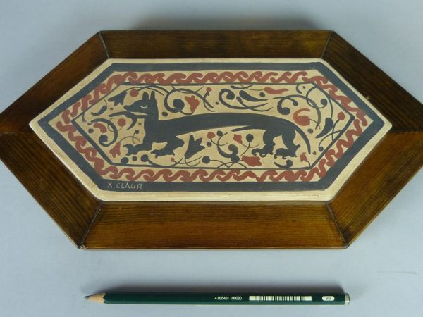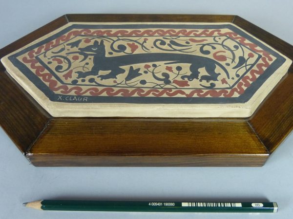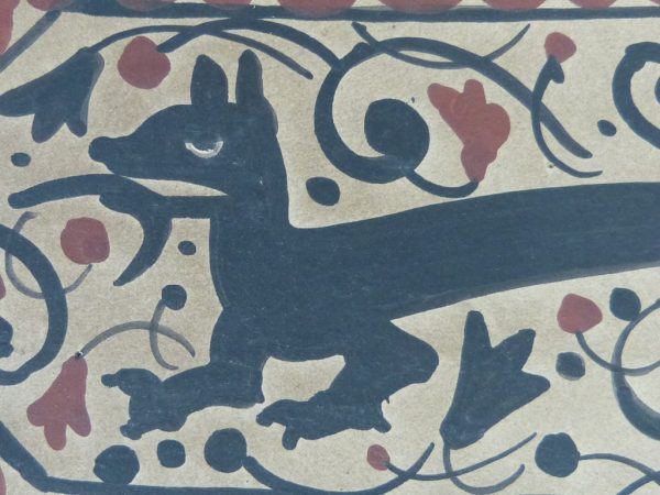Socarrat de cerámica de 10 x 10 cm, pintado a mano, con marco, con la imagen de un lobo alfardo. El Socarrat también se puede servir sin marco. Consúltenos »