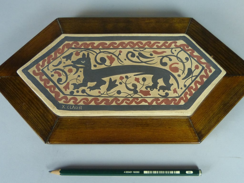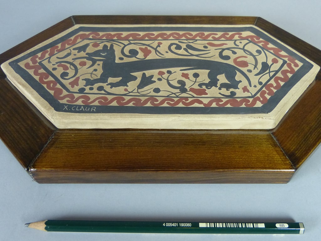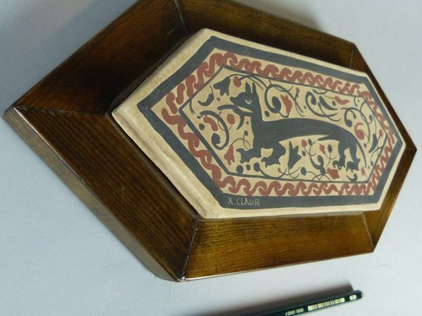 Socarrat de 10 x 10 cm, pintado a mano, con marco, con la imagen de un lobo alfardo. El Socarrat también se puede servir sin marco.
