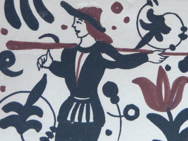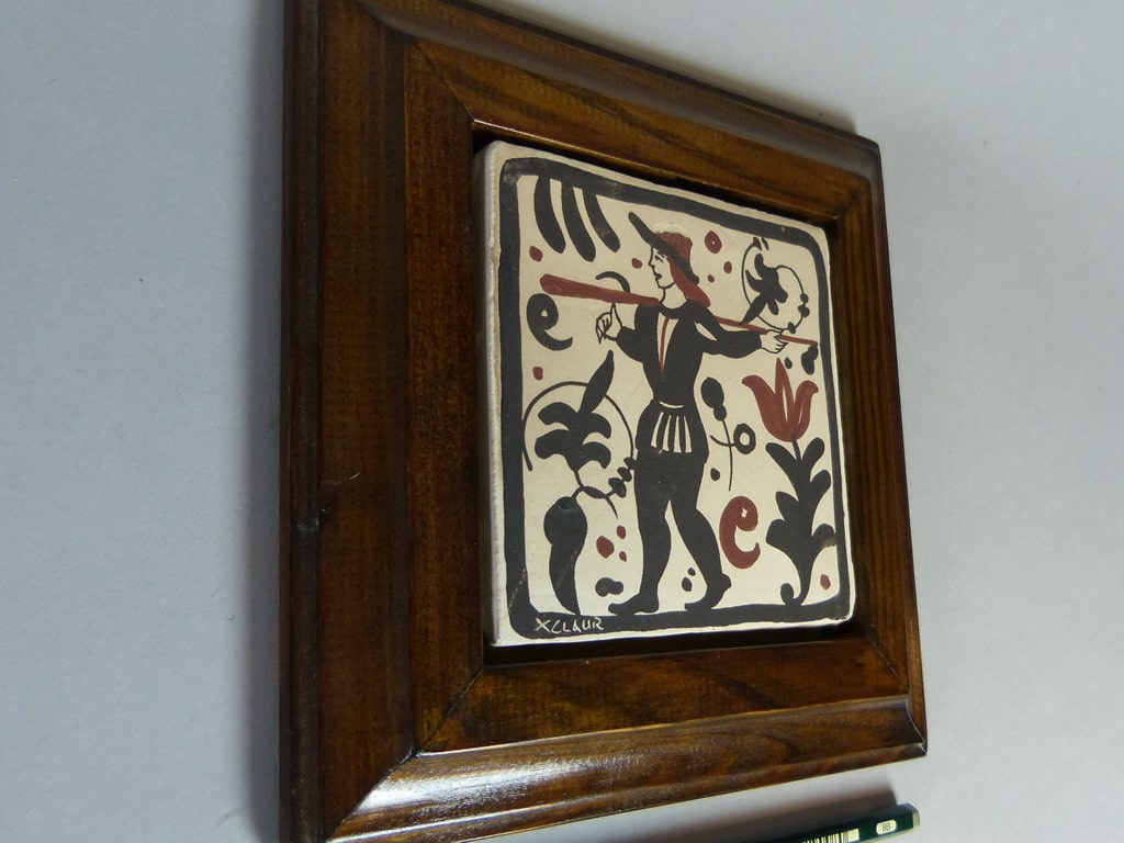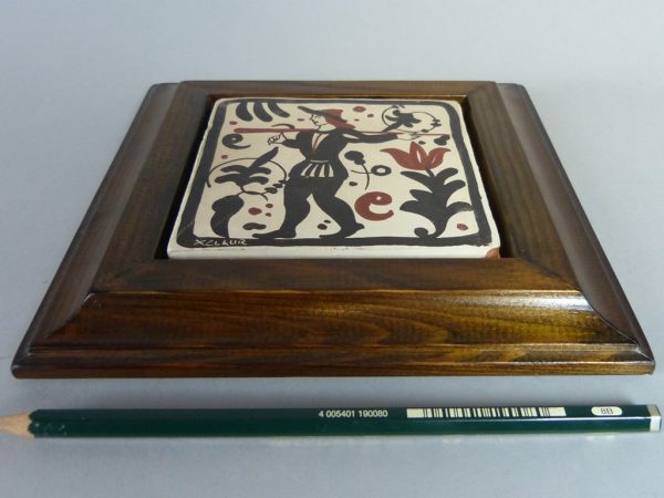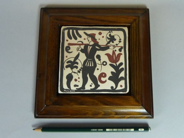 Socarrat de cerámica de 10 x 10 cm, pintado a mano, con marco, con la imagen de un hombre caminando con un bastón al hombro. El Socarrat también se puede servir sin marco. Consúltenos »