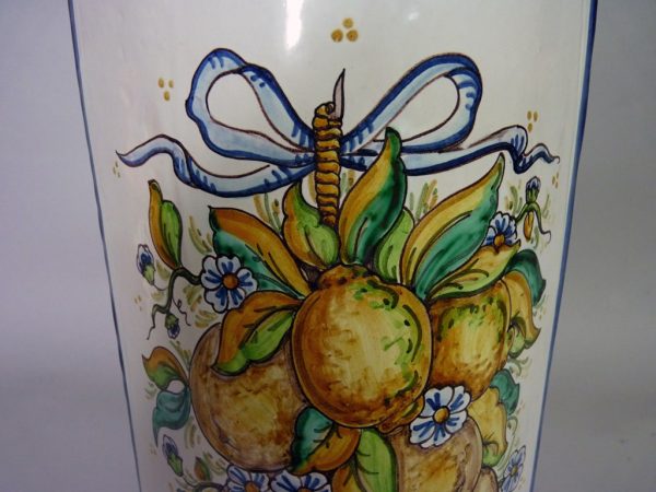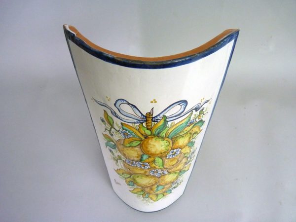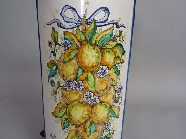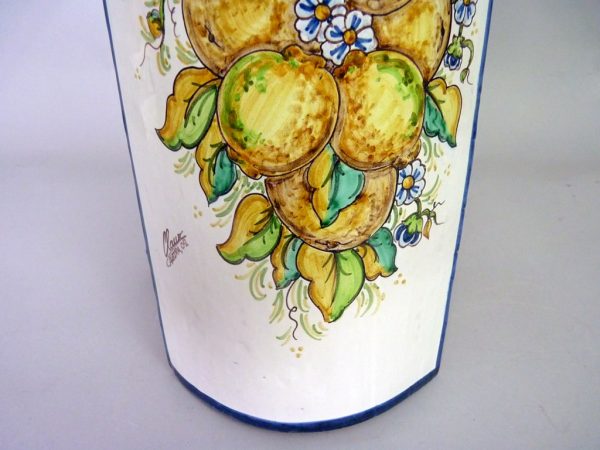 Teja de Cerámica decorativa pintada a mano con dibujo de limones. Realizamos en cerámica esmaltada cualquier tipo de teja estándar, escamas, caballones, cubre tejas y todo tipo de remates arquitectónicos. Reproducción de tejas de cerámica de cualquier tamaño y color así como también en dorado y reflejo metálico. Consúltenos »