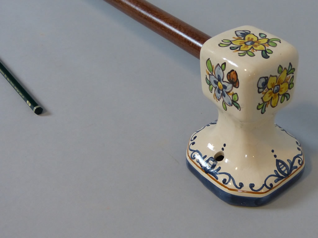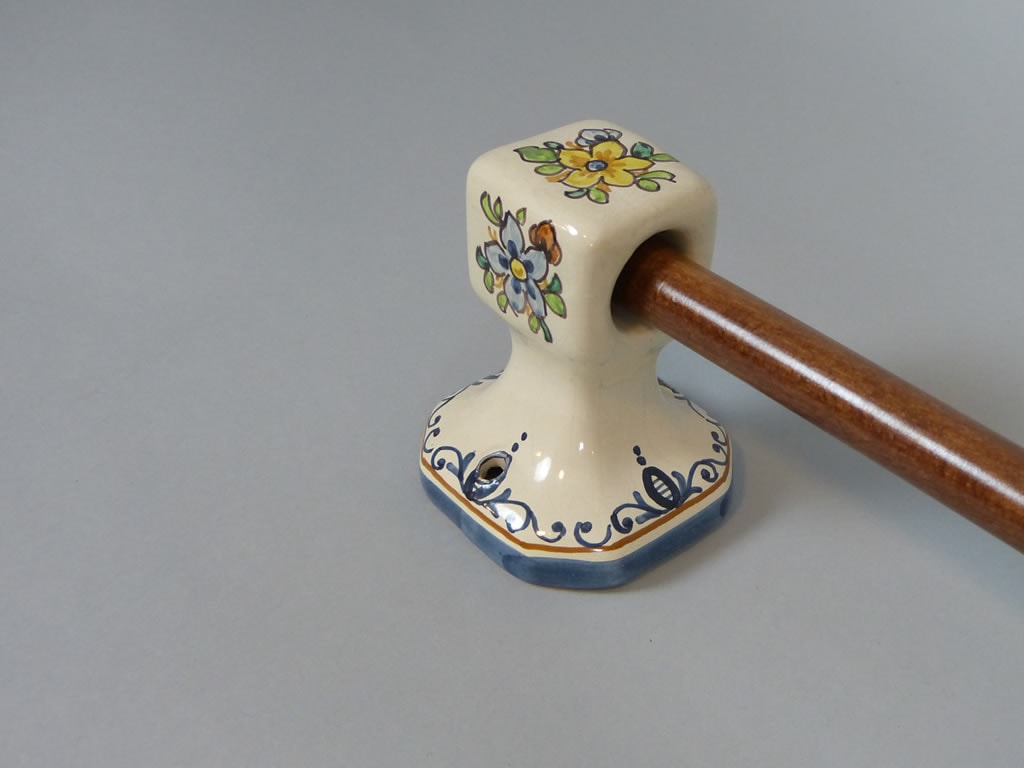 Toallero de cerámica de barra de madera, decorado con flores. La decoración puede ser como el cliente indique o a juego con los colores de su baño. Consúltenos »